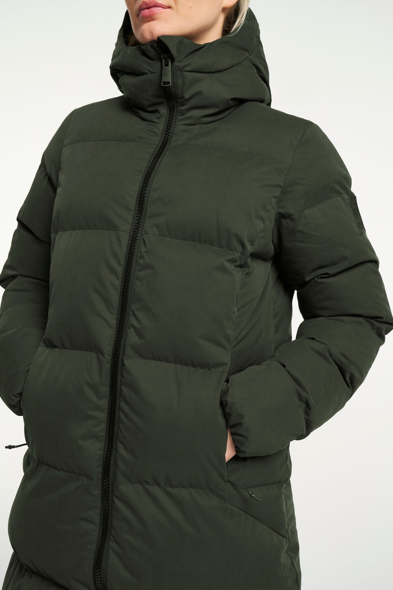 A timeless long parka crafted with cozy, soft polyester and a powdery, brushed finish that will stand the test of whatever Mother Nature might throw at you on your daily commute. It is padded with Airpush InsulateTM, Cevina has a sleek a-lined silhouette and a minimalistic look with black details and designer oversized zippers, on the front and sleeves. Comes with a PFC free water-repellent finish.