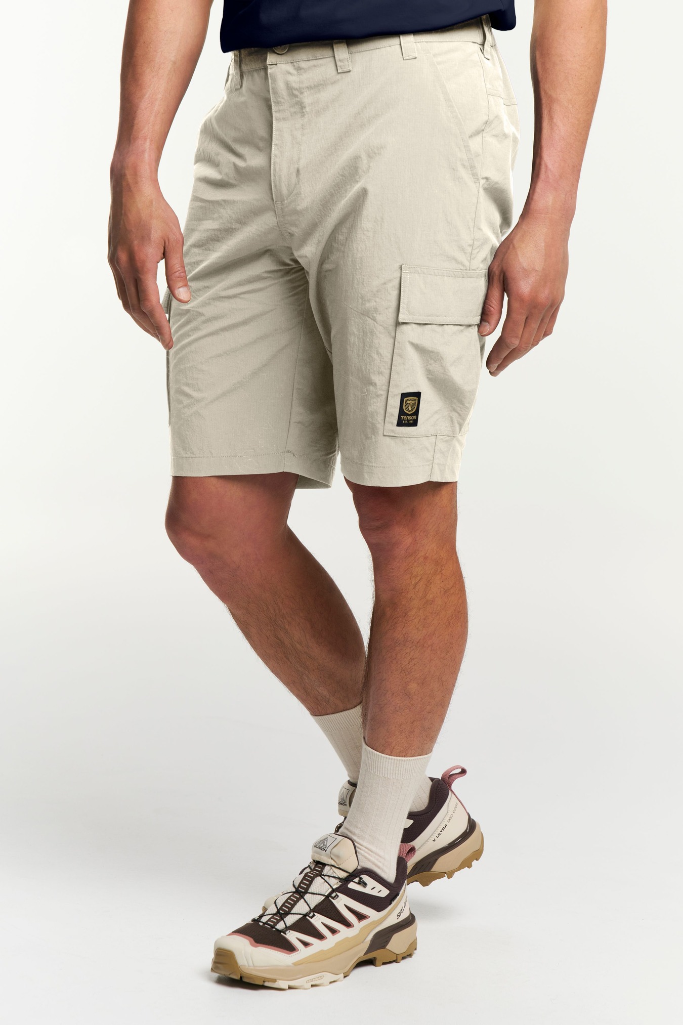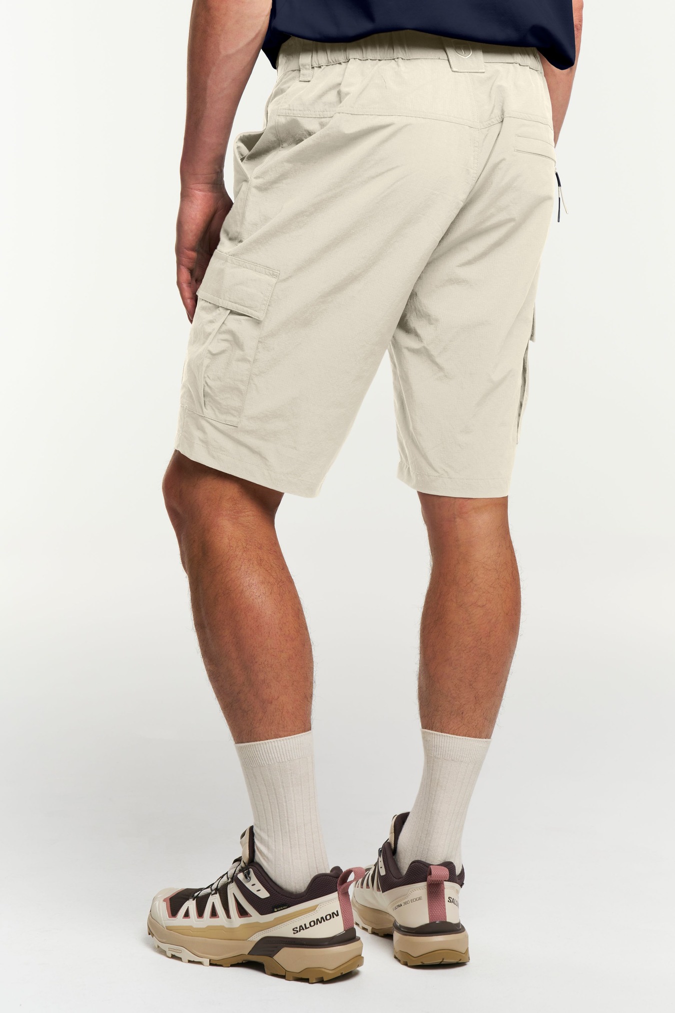 Made in durable quick drying recycled polyamide, these travel-friendly ripstop cargo shorts features an elastic waist, one zippered back pocket, two leg pockets and two slanted open front pockets.